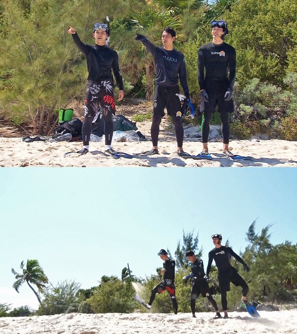 기세등등하게 섬에 도착한 세 사람은 곧바로 허당의 면모를 드러냈다. 잠수하기 민망할 정도로 낮은 수심 때문에 자세가 어정쩡했을 뿐 아니라, 해초가 시야를 가려 좀처럼 앞으로 나아가질 못했기 때문. 더불어 꽃과 식물을 사랑하는 ‘소녀 감성’ 오만석은 해초를 그냥 지나치지 못하고 감상에 젖어 들기도 했다.