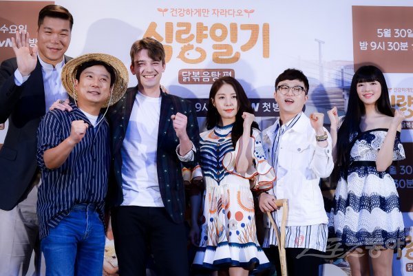 25일 서울 마포구 상암동 CJ E&M 센터에서 열린 tvN 새 예능 ‘식량일기 닭볶음탕’ 제작발표회에서 출연 배우들이 포즈를 취하고 있다.