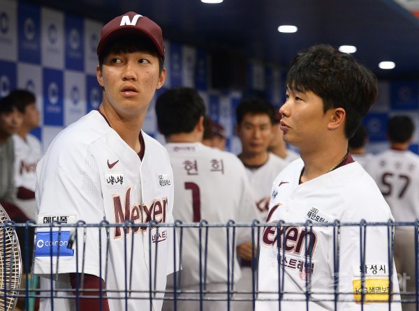 25일 서울 고척스카이돔에서 ‘2018 신한은행 MY CAR KBO리그’ 롯데자이언츠와 넥센히어로즈 경기가 열린다. 경기를 앞두고 넥센 안우진이 팀 동료와 대화를 나누며 경기장을 둘러보고 있다.