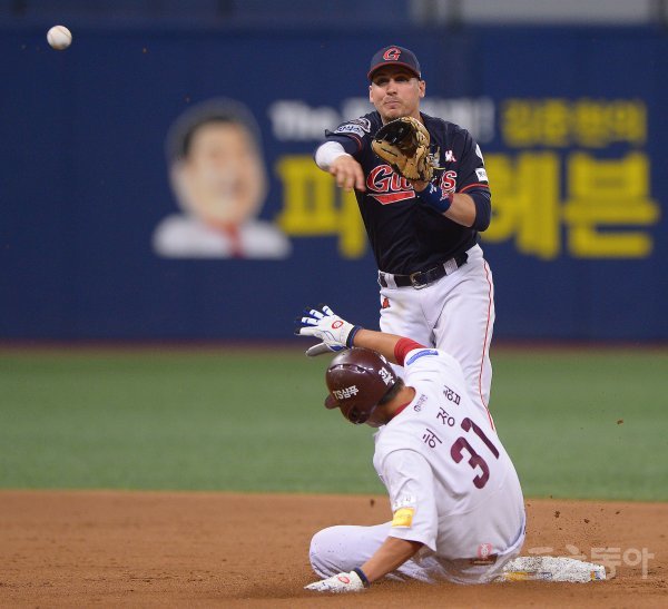 25일 서울 고척스카이돔에서 ‘2018 신한은행 MY CAR KBO리그’ 롯데자이언츠와 넥센히어로즈 경기가 열렸다. 7회말 무사 1,2루에서 롯데 2루수 번즈가 넥센 김민성의 유격수 앞 땅볼에서 2루로 향하는 허정협을 포스아웃 시킨 후 1루로 송구하고 있다.