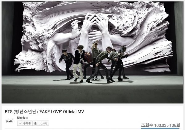방탄소년단의 <FAKE LOVE> 뮤직비디오는 5분이 넘는 분량임에도 공개 후 8시간 54분만인 19일 2시 54분경 2000만 뷰를 넘었다. 이보다 앞선 18일 22시 55분경에는 공개 4시간 55분만에 1000만 조회수를 돌파했다.