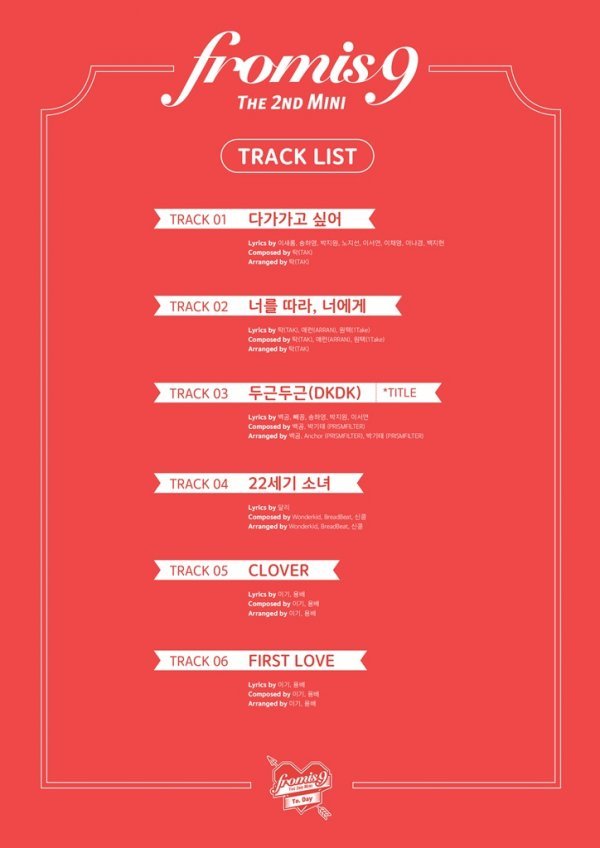 타이틀곡 외에 ‘다가가고 싶어’를 시작으로 ‘너를 따라, 너에게’, ‘22세기 소녀’, ‘클로버(CLOVER)’, ‘퍼스트 러브(FIRST LOVE)’까지 곡명만으로도 설렘 지수를 높이는 총 여섯 개의 트랙이 수록되어 있다. 특히 앨범의 포문을 여는 1번 트랙에는 프로미스나인 멤버 전원이 작사를 맡아 어떠한 이야기를 들려줄 지 궁금증이 더해진다.