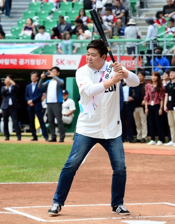 27일 인천 SK행복드림구장에서 ‘2018 신한은행 마이카 KBO리그’ SK 와이번스와 한화 이글스의 경기가 열렸다. 경기에 앞서 6.13 지방선거 독려차 양준혁 스포츠플러스 해설위원이 시타를 하고 있다.