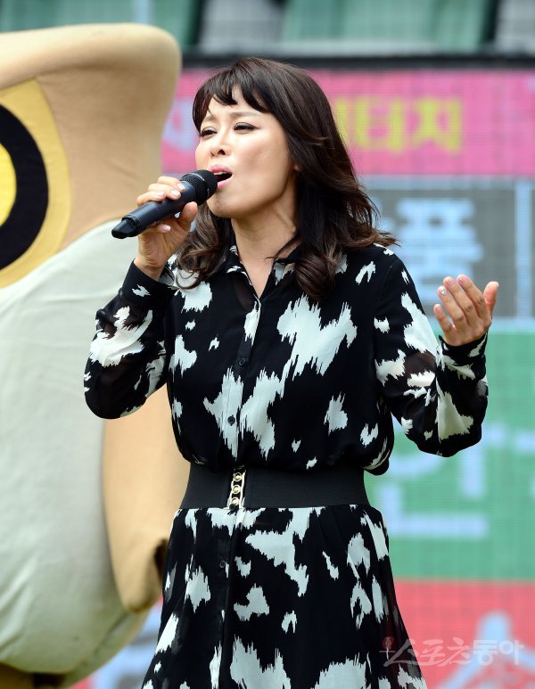 27일 인천 SK행복드림구장에서 ‘2018 신한은행 마이카 KBO리그’ SK 와이번스와 한화 이글스의 경기가 열렸다. 뮤지컬배우 홍지민이 애국가를 부르고 있다.