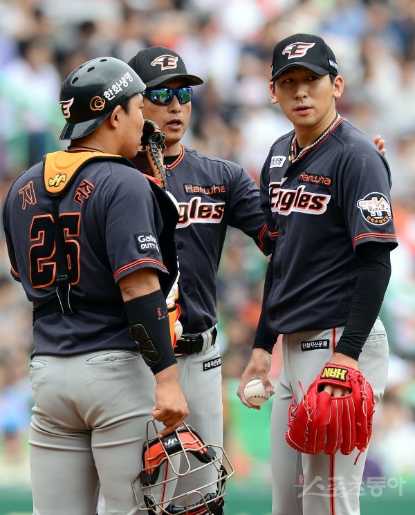 27일 인천 SK행복드림구장에서 ‘2018 신한은행 마이카 KBO리그’ SK 와이번스와 한화 이글스의 경기가 열렸다. 5회말 2사 만루에서 SK 김동엽에게 적시타를 허용한 한화 선발 김재영이 교체되고 있다.