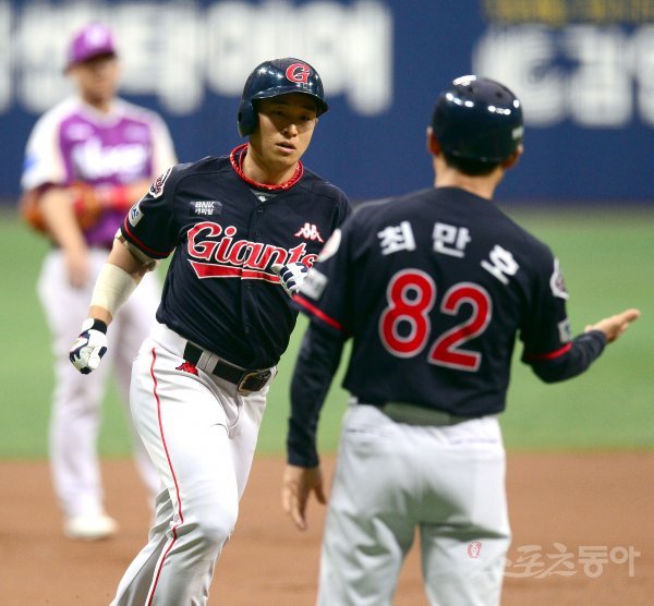 27일 서울 고척스카이돔에서 ‘2018 신한은행 MY CAR KBO리그’ 롯데자이언츠와 넥센히어로즈 경기가 열렸다. 1회초 무사 롯데 손아섭이 중월 솔로 홈런을 날리고 그라운드를 돌며 하이파이브 하고 있다.