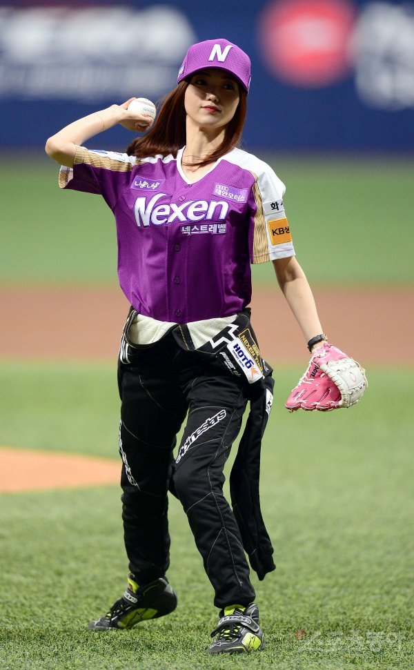 27일 서울 고척스카이돔에서 ‘2018 신한은행 MY CAR KBO리그’ 롯데자이언츠와 넥센히어로즈 경기가 열렸다. 경기 전 넥센타이어 스피드레이싱 한명희 선수가 시구를 하고 있다.