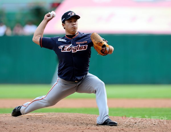 27일 인천 SK행복드림구장에서 ‘2018 신한은행 마이카 KBO리그’ SK 와이번스와 한화 이글스의 경기가 열렸다. 7회말 한화 서균이 구원등판해 볼을 던지고 있다.