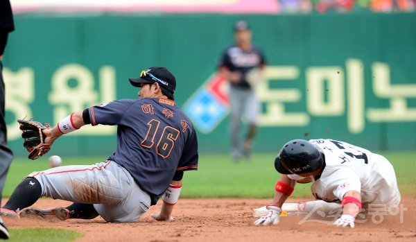 27일 인천 SK행복드림구장에서 ‘2018 신한은행 마이카 KBO리그’ SK 와이번스와 한화 이글스의 경기가 열렸다. 6회말 2사 1루에서 SK 한동민 타석 때 폭투로 1루 주자 노수광이 2루까지 진루하고 있다.