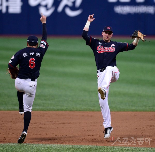 27일 서울 고척스카이돔에서 ‘2018 신한은행 MY CAR KBO리그’ 롯데자이언츠와 넥센히어로즈 경기가 열렸다. 6-4 승리를 거둔 후 롯데 문규현과 번즈가 기뻐하고 있다.