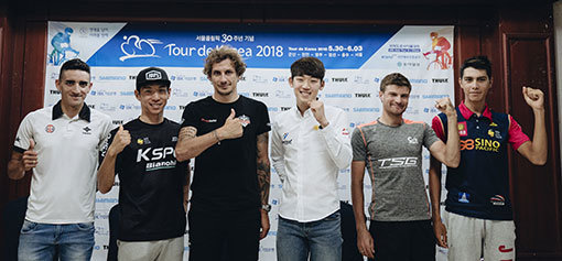 국내 유일의 국제도로사이클대회 ‘투르 드 코리아 2018’이 30일 대장정을 시작한다. 대회 개막 하루를 앞둔 29일 열린 기자회견에서 참가선수들이 선전을 다짐하고 있다. 사진제공 | 국민체육진흥공단