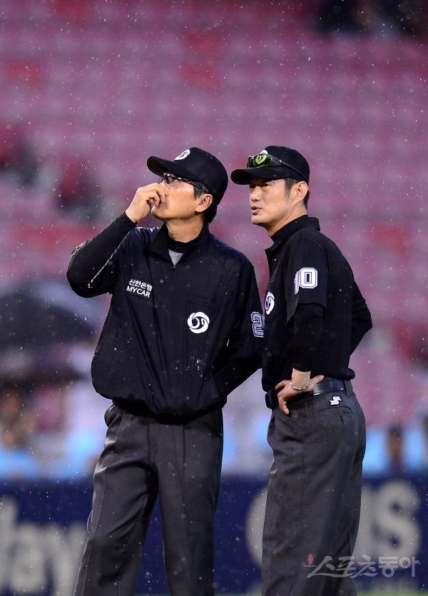 29일 서울 잠실야구장에서 ‘2018 신한은행 MY CAR KBO리그’ SK와이번스와 두산베어스 경기가 열렸다. 경기 중 비가 많이 내리자 강광회 심판과 나광남 심판이 하늘을 보며 이야기 하고 있다.
