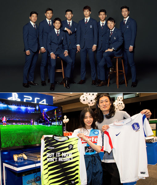 삼성물산 패션부문 갤럭시가 제작한 대한민국 축구 국가대표팀 공식 단복(위쪽)과 현대백화점의 ‘풋볼 라이프스타일 페어’. 러시아 월드컵이 임박한 요즘 산업계 전반에 축구 마케팅이 한창이다. 사진제공|삼성물산 패션부문·현대백화점