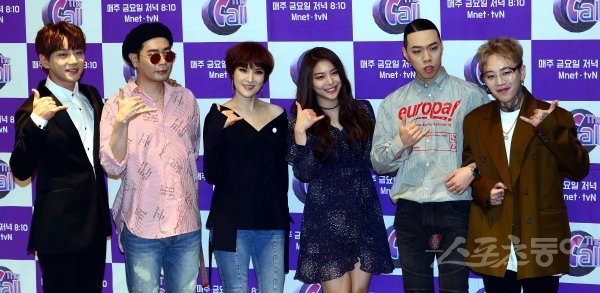 30일 서울 상암동 스탠포드호텔에서 열린 Mnet 러브콜라보 반전뮤직쇼 ‘더 콜’ 기자간담회에서 황치열, UV 뮤지, 거미, 에일리, 비와이, 태일이 포토타임을 갖고 있다.