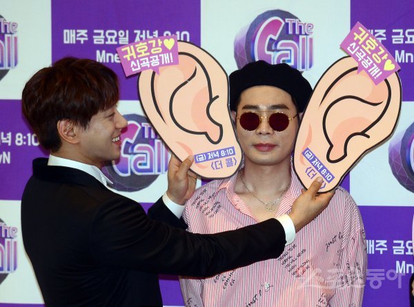 30일 서울 상암동 스탠포드호텔에서 열린 Mnet 러브콜라보 반전뮤직쇼 ‘더 콜’ 기자간담회에서 황치열과 UV 뮤지가 포토타임을 갖고 있다.