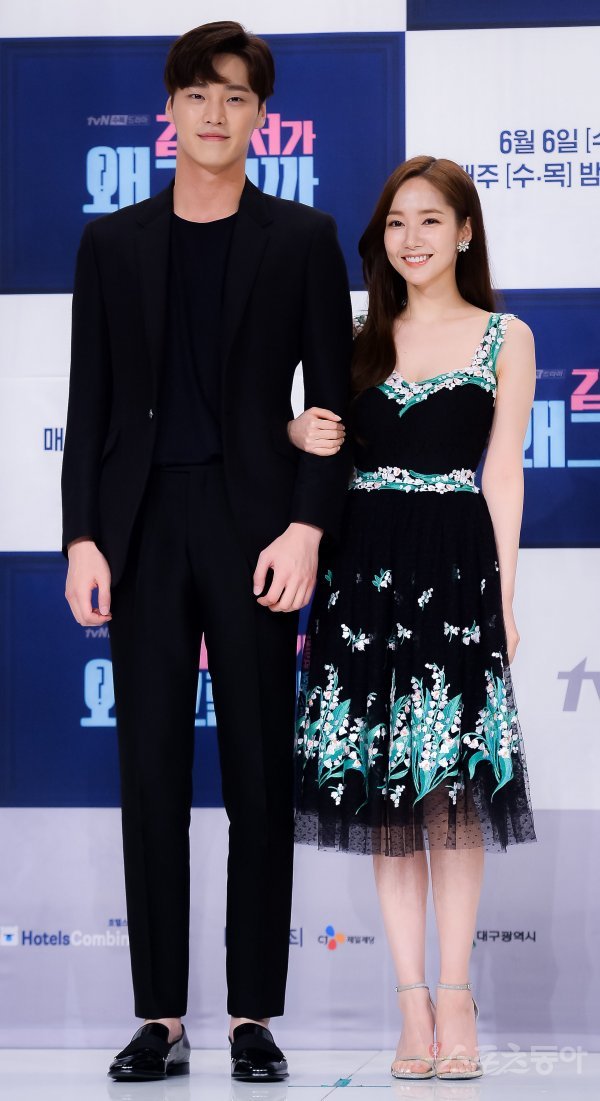 배우 이태환과 박민영(오른쪽)이 30일 서울 영등포 타임스퀘어 내 아모리스 홀에서 진행된 tvN 드라마 ‘김비서가 왜 그럴까’ 제작발표회에 참석해 포즈를 취하고 있다.