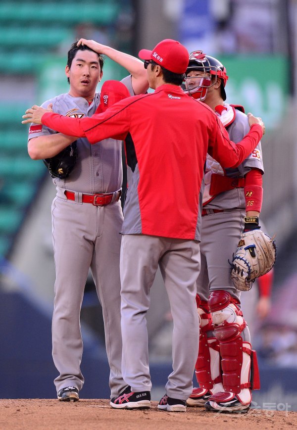 30일 서울 잠실야구장에서 ‘2018 신한은행 MY CAR KBO리그’ SK와이번스와 두산베어스 경기가 열렸다. 1회말 2사 1,2루 상황에서 SK 손혁 코치가 마운드에 올라 선발 문승원과 이성우에게 이야기를 하고 있다.
