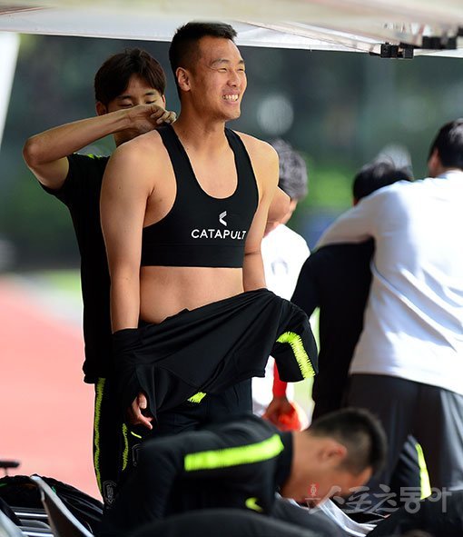 '2018 러시아월드컵'을 앞두고 한국축구대표팀이 24일 파주 축구국가대표트레이닝센터(NFC)에서 훈련을 가졌다. 훈련에 앞서 김신욱이 체력측정용 수신기를 몸에 달고 있다. 파주 | 김민성 기자 marineboy@donga.com