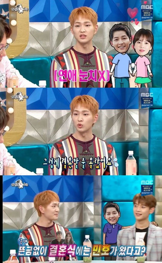 이에 MC들은 “정작 결혼식은 민호가 갔다”고 언급해 웃음을 안겼다. 그러자 민호는 “송중기씨가 저희와 데뷔 시기가 비슷하다. 그때 인연으로 지금까지 연락하고 있다”고 친분을 드러냈다.