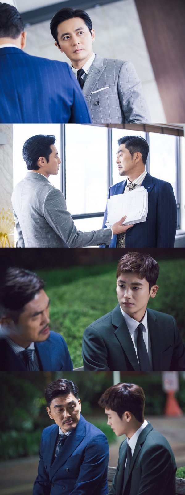 최강석은 11회에서 노골적으로 함대표에 대한 적개심을 드러냈다. 그렇기에 함대표를 대하는 최강석의 눈빛과 표정에는 적대감이 서려있다. 서류뭉치로 함대표 가슴을 턱 치는 최강석의 모습이 긴장감을 유발한다. 반면 고연우는 함대표에 대해 조심스러운 반응을 보이는 것으로 짐작된다. 어두운 밤 나란히 앉아 대화를 나누게 된 고연우가 표정에 감정을 좀처럼 드러내지 않은 것이다.