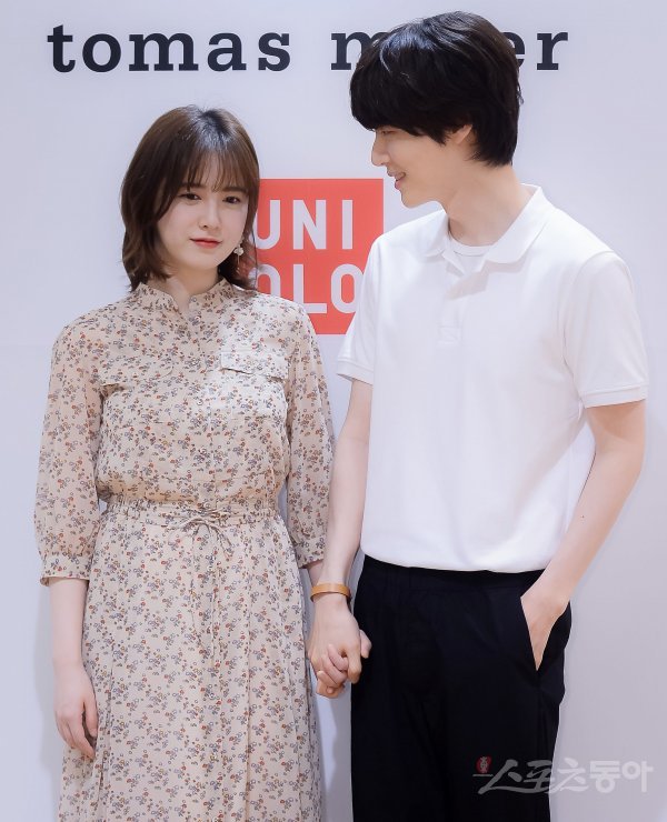 배우 구혜선과 안재현(오른쪽)이 31일 서울 중구 유니클로 명동 중앙점에서 열린 유니클로 리조트웨어 컬렉션 런칭 기념 포토월 행사에 참석해 포토타임을 갖기 전 대화를 나누고 있다.