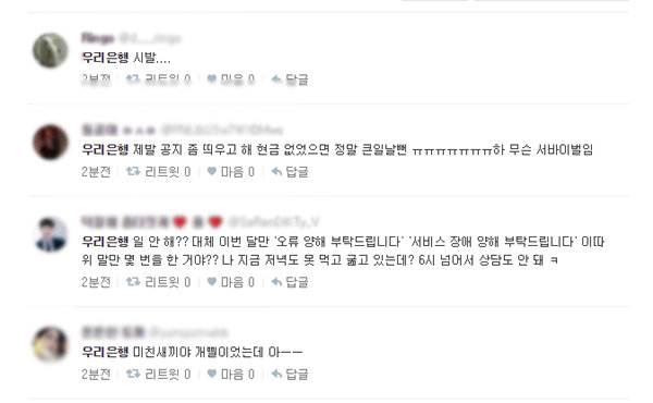 한 고객은 “우리은행 인터넷뱅킹이 아무것도 안 되고 있다”고 불편함을 전했다. 또 다른 고객 역시 “우리은행 인터넷뱅킹을 통해 월급이 들어온 것을 확인하려고 하는데 전혀 되지 않는다”고 적었다.