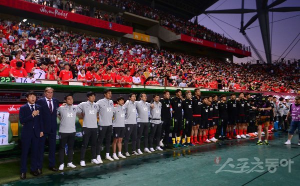 2018 국제축구연맹(FIFA) 러시아 월드컵을 앞둔 한국 축구대표팀(FIFA 랭킹 61위)이 1일 전주월드컵경기장에서 보스니아 헤르체고비나(FIFA 랭킹 41위)와 평가전을 가졌다. 한국 신태용 감독과 선수들이 국민의례를 하고 있다.