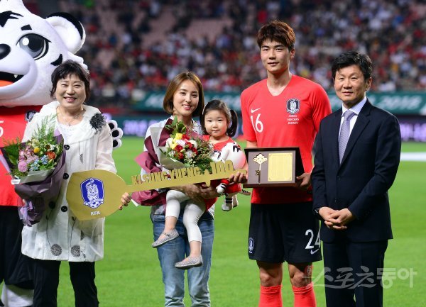 2018 국제축구연맹(FIFA) 러시아 월드컵을 앞둔 한국 축구대표팀(FIFA 랭킹 61위)이 1일 전주월드컵경기장에서 보스니아 헤르체고비나(FIFA 랭킹 41위)와 평가전을 가졌다. 보스니아전에 출전하며 A매치 100경기 출전을 달성한 기성용이 어머니 남영숙 씨, 아내 한혜진과 딸, 정몽규 회장과 기념촬영을 하고 있다. 전주 | 김종원 기자 won@donga.com