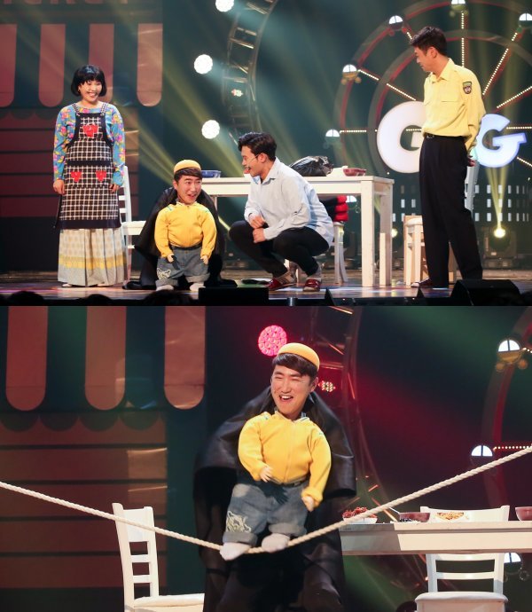 공개된 사진 속에선 일주일만에 갓난아기에서 유치원생으로 몰라보게 자란 장동민의 모습이 시선을 끌고 있다. 병아리 같은 노란 상의와 모자가 깜찍함을 더해 아빠 역의 김대희와 엄마 역의 신봉선 역시 그를 바라보며 흐뭇한 미소를 짓고 있다.