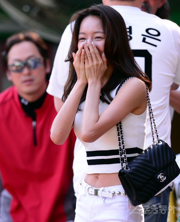 시구를 던진 김선형을 바라보며 부인이 놀라워하고 있다.