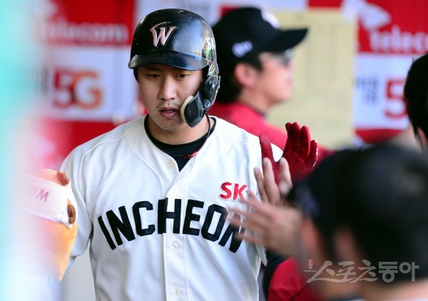 2회말 무사 1루에서 SK 김동엽이 kt 선발 니퍼트를 상대로 좌월 역전 투런 홈런을 쏘아 올린뒤 동료들의 환영을 받고 있다.