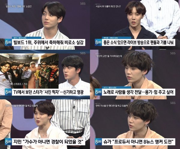 방탄소년단은 3일 방송된 SBS 8뉴스에 등장해 김용태 앵커와 대담을 가졌다. 이들은 빌보드 차트 1위 소감과 더불어 고난도 퍼포먼스에 대한 자부심, 팬들을 향한 애정을 가감없이 드러냈다.
