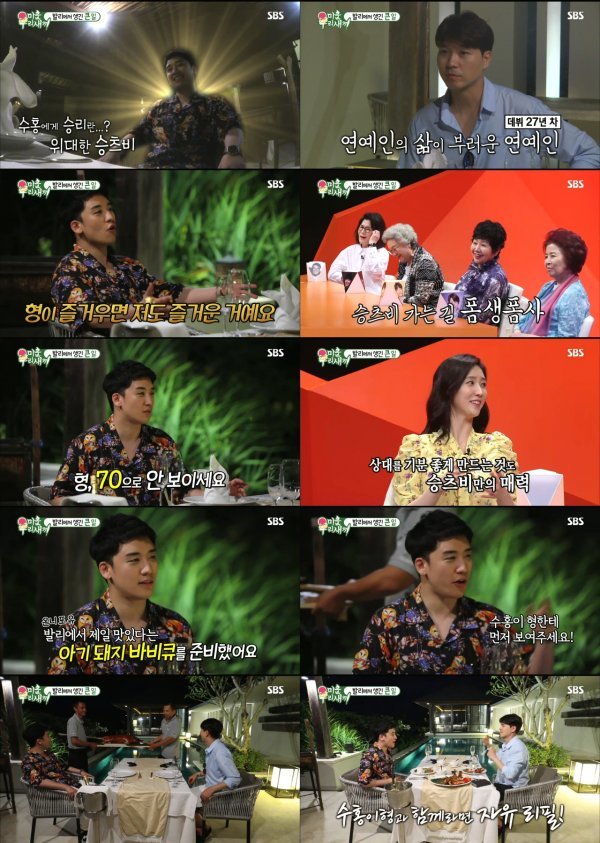 이때 초대한 손님을 배려하는 승리의 세심한 매너가 돋보였다. 승리는 어쩔 줄 몰라 하는 수홍을 향해 “형이 즐거우면 저도 즐겁다”며 함께 기뻐해 주고, 훨씬 나이가 많은 수홍의 부담감을 덜어주기 위해 “진짜 훨씬 더 젊어 보인다”거나 “친구들이랑도, 멤버 형들이랑도 이렇게 많이 이렇게 한다”라며 분위기를 전환했다.