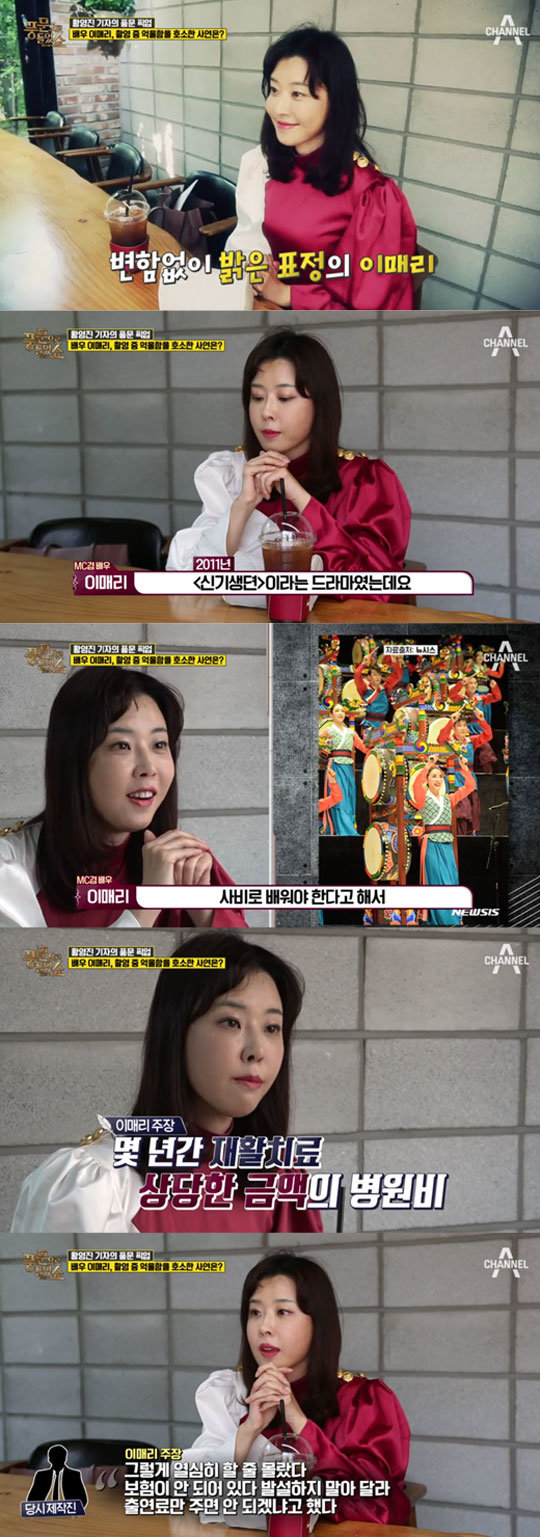 4일 방송된 채널A ‘풍문으로 들었쇼’에서는 황영진 기자가 방송인 이매리를 만났다. 이날 이매리는 그동안 방송에서 볼 수 없었던 이유에 대해 “‘신기생뎐’(2011년)을 찍을 당시 무리를 하는 바람에 무릎에 물이 찼다”면서 “개인적으로 쓴 레슨비가 한 600만원 정도였고, 치료비는 몇 천만원이 들었다. 그런데 보험이 안되어 있으니 (해줄 수 없다)고 했고, 발설하지 말라, 출연료만 주면 안되겠냐고 하더라”고 주장했다.