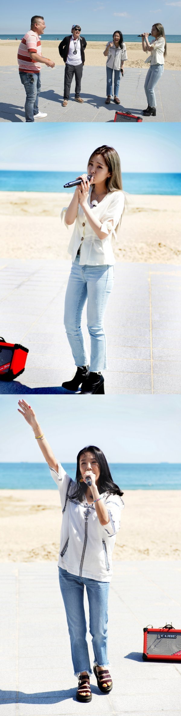 가수 헤이즈와 유빈이 해운대 한복판에서 버스킹 공연을 펼쳤다.