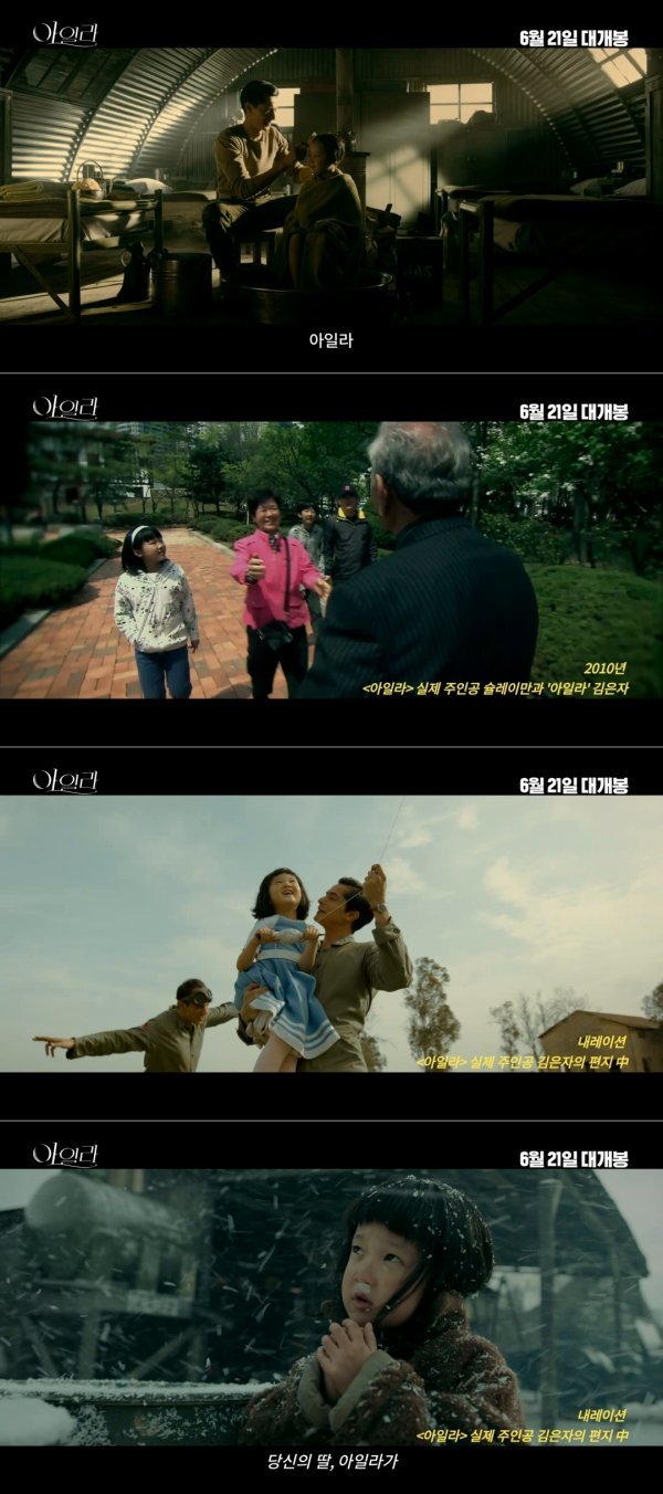 1950년 6.25전쟁에 참전한 터키 병사 ‘슐레이만’과 한국의 전쟁고아 ‘아일라’의 기적 같은 감동 실화 ‘아일라’가 6월 21일 개봉을 앞둔 가운데, 30초 예고편을 전격 공개해 기대를 모은다. ‘아일라’는 참혹한 전쟁 속 고아가 된 한국 소녀를 만난 한국전쟁 파병군 ‘슐레이만’이 소녀에게 ‘아일라’라는 이름을 붙여주게 되면서 시작된 세상 가장 아름답고 애틋한 사랑을 담은 감동 실화.