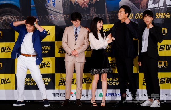 5일 서울 영등포구 여의도 콘래드 서울에서 열린 OCN 오리지널 ‘라이프 온 마스’ 제작발표회에서 출연 배우들이 포즈를 취하고 있다. 왼쪽부터 배우 오대환, 정경호, 고아성, 박성웅, 노종현.