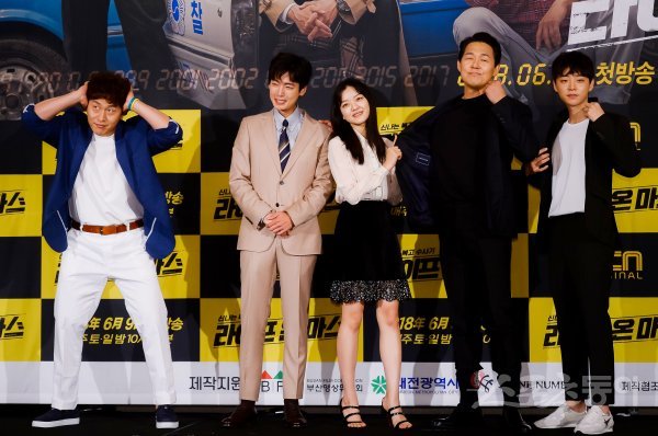 5일 서울 영등포구 여의도 콘래드 서울에서 열린 OCN 오리지널 ‘라이프 온 마스’ 제작발표회에서 출연 배우들이 포즈를 취하고 있다. 왼쪽부터 배우 오대환, 정경호, 고아성, 박성웅, 노종현.