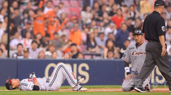 5일 서울 잠실야구장에서 ‘2018 신한은행 MY CAR KBO리그’ 한화이글스와 LG트윈스 경기가 열렸다. 2회말 1사 LG 정주현이 안타를 치고 3루까지 쇄도해 세이프 되고 있다. 한화 요청으로 비디오 판독을 실시했지만 번복되지 않았다.
