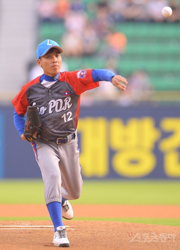 5일 서울 잠실야구장에서 ‘2018 신한은행 MY CAR KBO리그’ 한화이글스와 LG트윈스 경기가 열렸다. 경기를 앞두고 라오스 국가대표 수아송이 시구를 하고 있다.