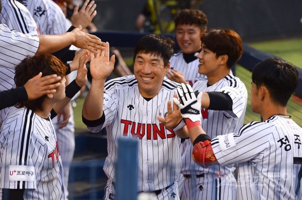 5일 서울 잠실야구장에서 ‘2018 신한은행 MY CAR KBO리그’ 한화이글스와 LG트윈스 경기가 열렸다. 3회말 1사 2,3루에서 LG 양석환의 적시 2루타 때 홈을 밟은 김현수가 더그아웃에서 동료들의 축하를 받고 있다.