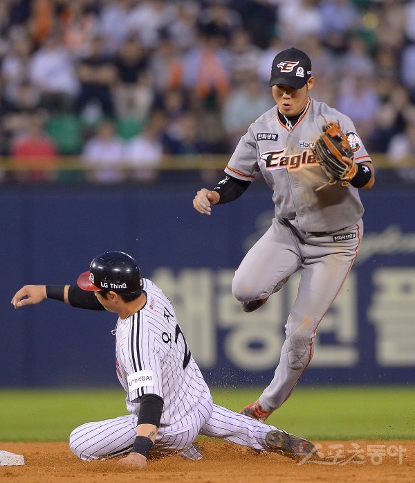 5일 서울 잠실야구장에서 ‘2018 신한은행 MY CAR KBO리그’ 한화이글스와 LG트윈스 경기가 열렸다. 4회말 무사 1,2루에서 한화 유격수 하주석이 LG 박용택의 2루수 앞 땅볼 때 2루로 향하는 오지환을 포스아웃 시키며 태클을 피해 점프를 하고 있다.
