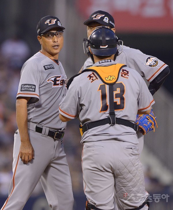5일 서울 잠실야구장에서 ‘2018 신한은행 MY CAR KBO리그’ 한화이글스와 LG트윈스 경기가 열렸다. 4회말 무사 1,2루에서 마운드에 올라간 한화 송진우 투수코치가 배영수와 대화를 나누고 있다.