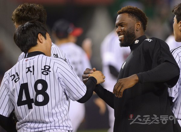5일 서울 잠실야구장에서 열린 ‘2018 신한은행 MY CAR KBO리그’ 한화이글스와 LG트윈스 경기에서 LG가 7-3 승리를 거두며 7연승을 질주했다. 경기 후 LG 소사가 김지용의 축하를 받고 있다.