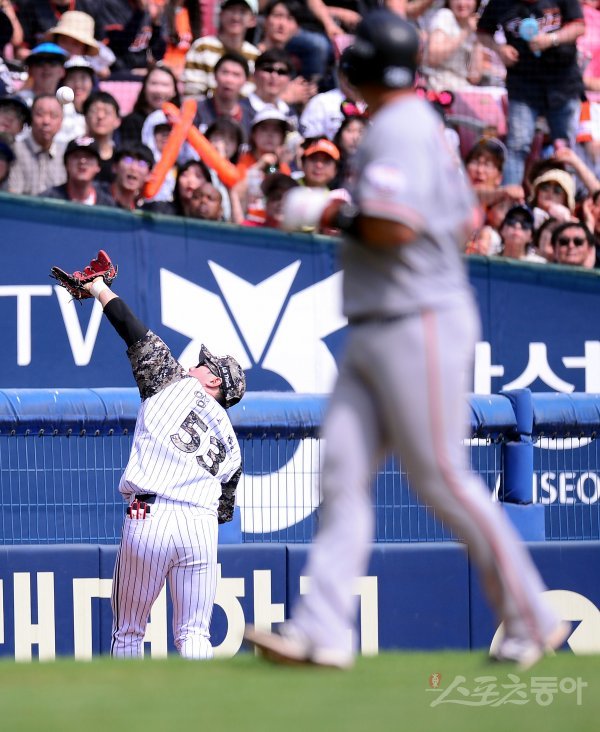 6일 서울 잠실야구장에서 ‘2018 신한은행 MY CAR KBO리그’ 한화이글스와 LG트윈스 경기가 열렸다. 선발 투수로 등판한 LG 손주영이 2회초 2사 만루 LG 양석환이 한화 송광민의 파울볼을 잡고 있다.