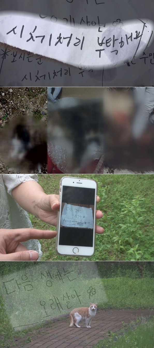 이 동네에 살고 있다는 캣맘 미주(가명) 씨는 지난 4월, 아파트 인근에서 심상찮은 쪽지를 발견했다. 그 안에는 ‘시체처리를 부탁 한다’는 섬뜩한 말이 적혀있었다. 그로부터 한 달 뒤, 믿기 힘든 장면을 목격했다. 그녀가 본 것은 잔혹하게 훼손되어 하반신만 남아 있는 새끼 고양이의 사체. 그런데 이상하게도, 고양이 사체에는 혈흔이 거의 묻어있지 않았다. 뿐만 아니라 복부의 장기도 제거 된 상태였다.