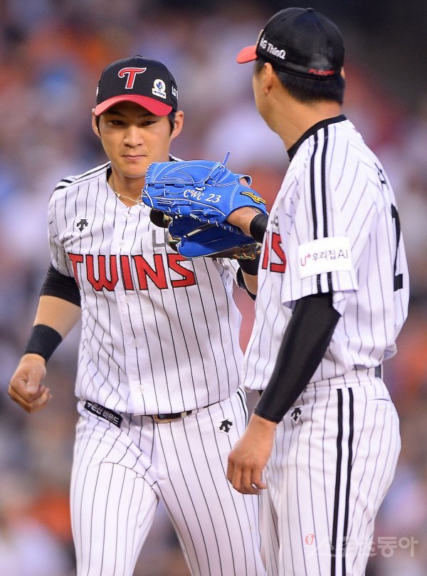7일 서울 잠실야구장에서 ‘2018 신한은행 MY CAR KBO리그’ 한화이글스와 LG트윈스 경기가 열렸다. 3회초 1사 만루에서 호수비로 이닝을 마친 LG 오지환이 선발 차우찬의 환영을 받고 있다.