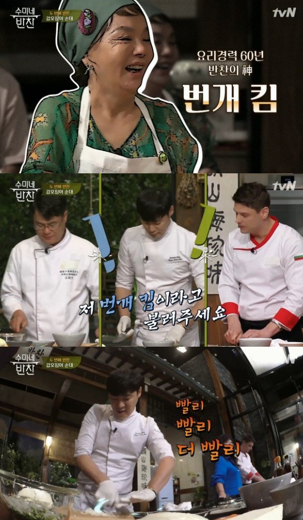 최현석 셰프는 "선생님 번개 같으세요. 조금만 천천히 해주세요"라고 말하며 칼질을 했다. 이에 김수미는 "나를 번개 킴이라고 불러달라"고 답했다.