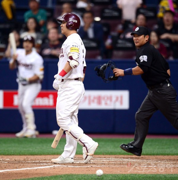 13일 서울 고척스카이돔에서 ‘2018 신한은행 MY CAR KBO리그’ 한화이글스와 넥센히어로즈 경기가 열렸다. 6회말 1사 2,3루 넥센 김민성이 사구를 맞아 출루하고 있다.