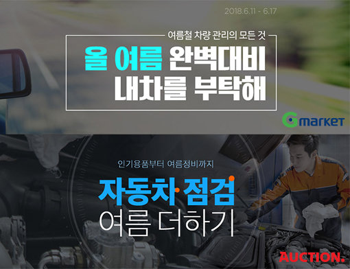 옥션은 ‘자동차 점검 여름 더하기’ 프로모션을 열고, 차량 필수용품 등을 최대 69% 할인 판매한다. 또 ‘아이나비’, ‘아이로드’, ‘파인디지털’사의 행사 제품을 10만원 이상 구매시 적용 가능한 1만원 중복할인쿠폰을 제공한다. 블랙박스, 네비게이션 구매 시 NH농협·KB국민·현대·신한카드로 결제하면 추가 8% 즉시할인도 제공한다.